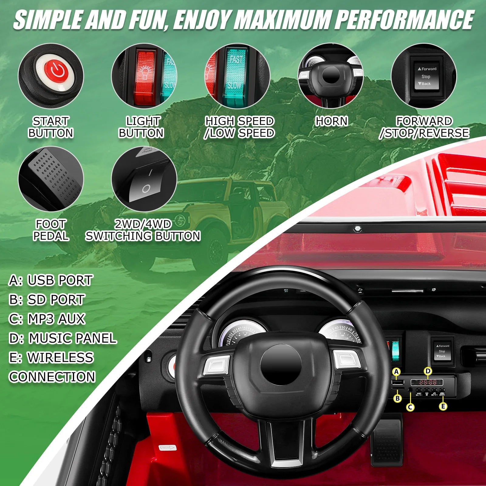 🎶🏎️【Stable and Funny Driving】This kids' ride-on toys come equipped with 4 stable spring suspension systems, providing your child with a smooth and comfortable ride. Equipped with Music player interfaces, your child can play their favorite music while driving.