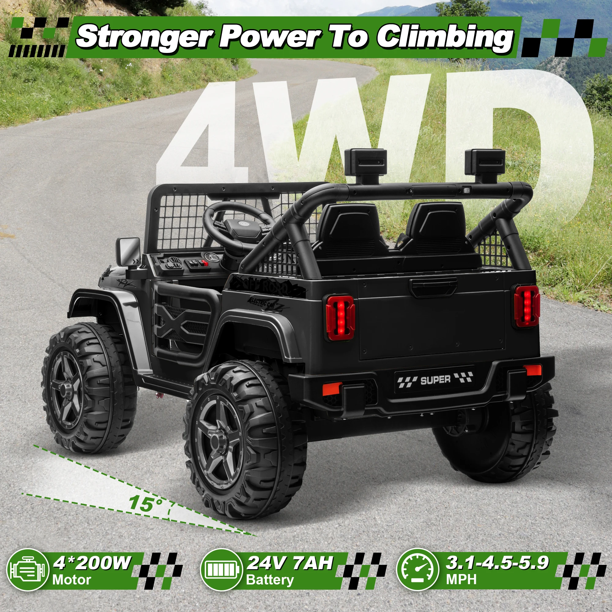 🚗Powerful Four Wheels -- Perfect for young adventurers, this powerful 24V ride-on car is ready to tackle many terrain. With 4 x 100W motors and a speeds range from 3.1 to 5.9 MPH, kids can cruise effortlessly across grass, brick, rubber, or asphalt. And with both 2WD and 4WD switchable modes, they can customize their ride for any adventure. Let your little one unleash their inner racer!