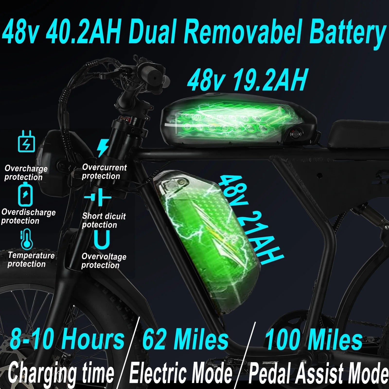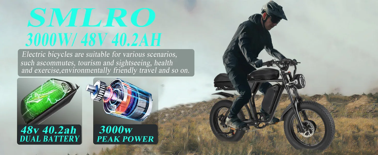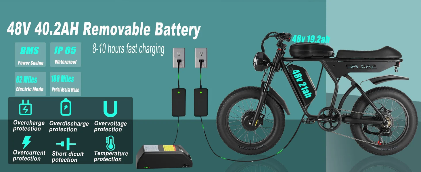 - Range: Up to 60+ km on a single charge with 48V 40.2AH lithium battery.