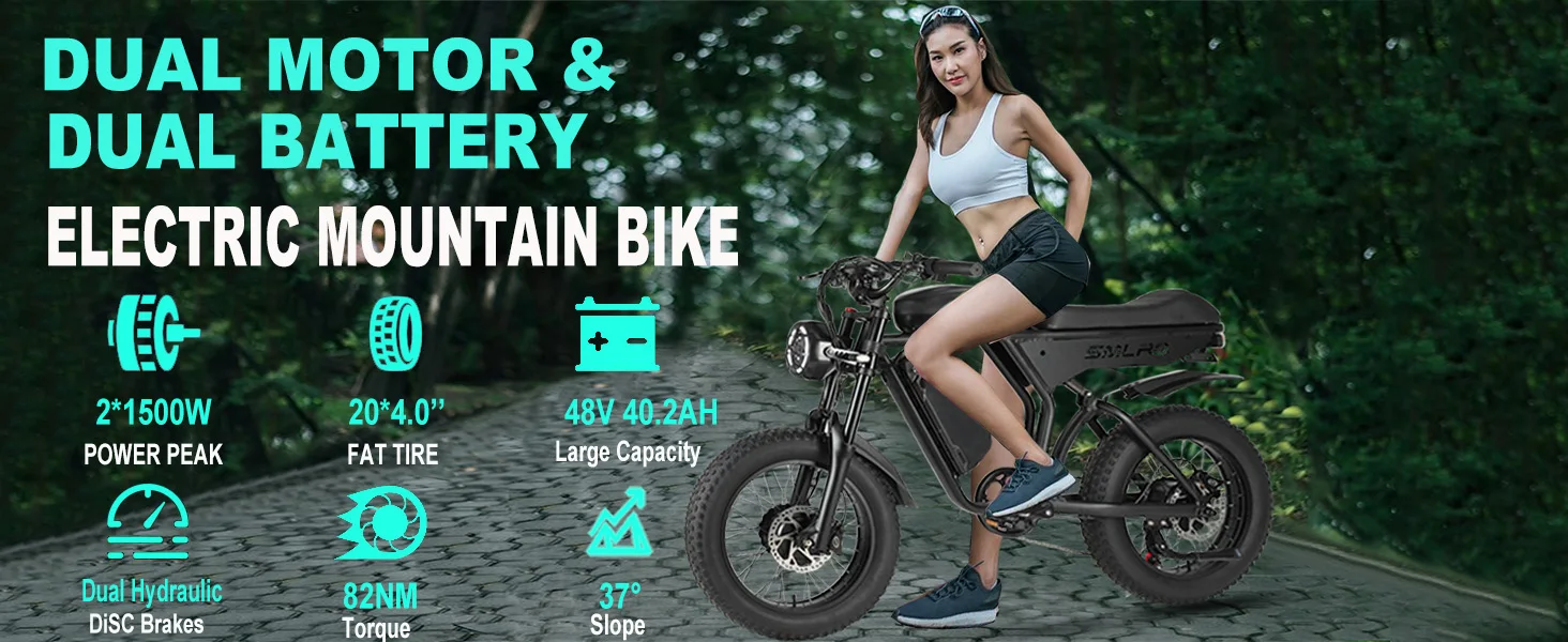 The VoltSurge 3000W Dual Motor Electric Mountain Bike is designed for thrill-seekers who crave power, speed, and adventure. Featuring 3000W dual brushless motors, this bike delivers impressive 30-50 km/h speeds and a rugged performance, perfect for off-road adventures, snowy trails, and steep hills. With a 48V 40.2AH lithium battery, you can enjoy a range of over 60 km per charge.