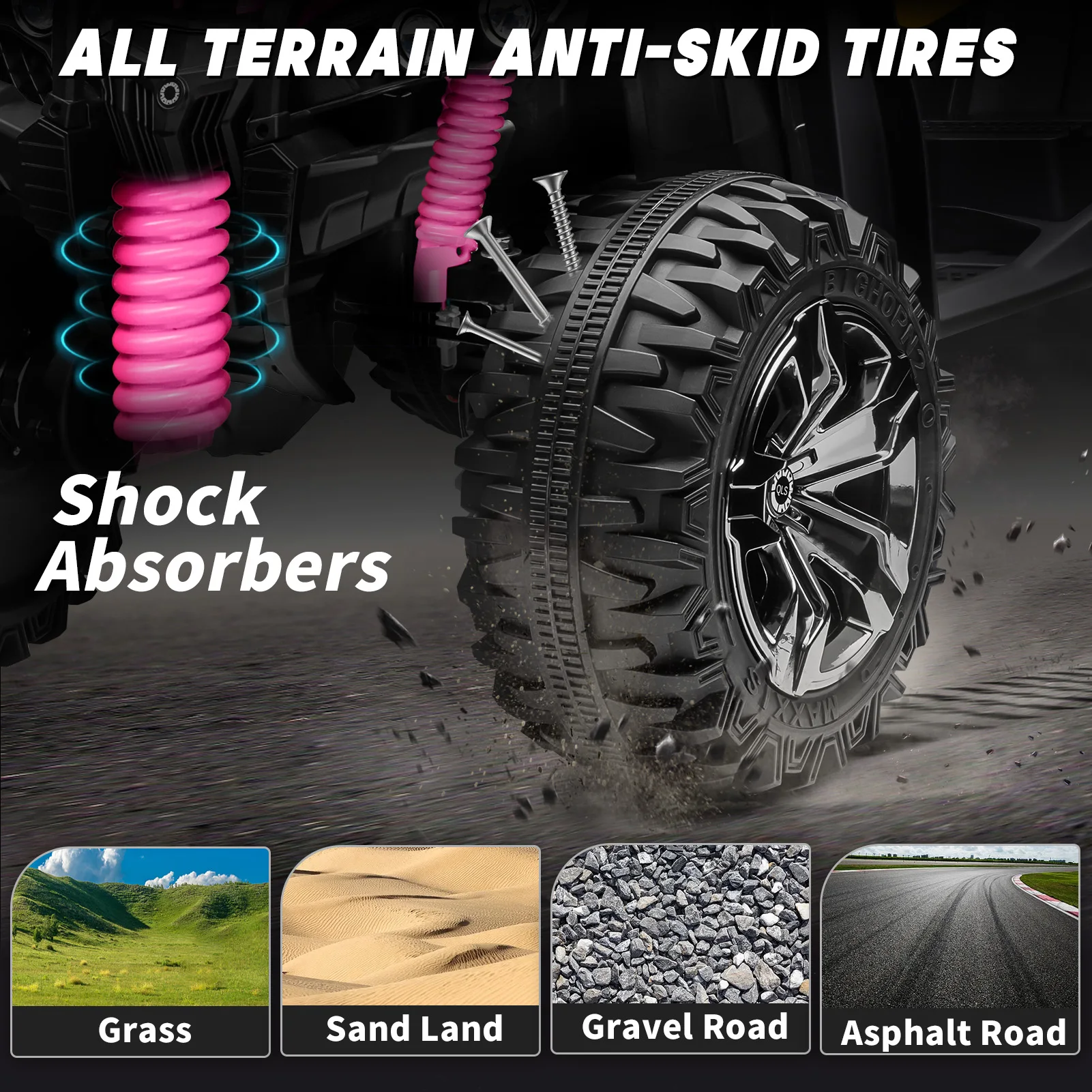 Built Tough for Real Outdoor Fun: Equipped with spring suspension, soft start, safety belts, and rugged tires.