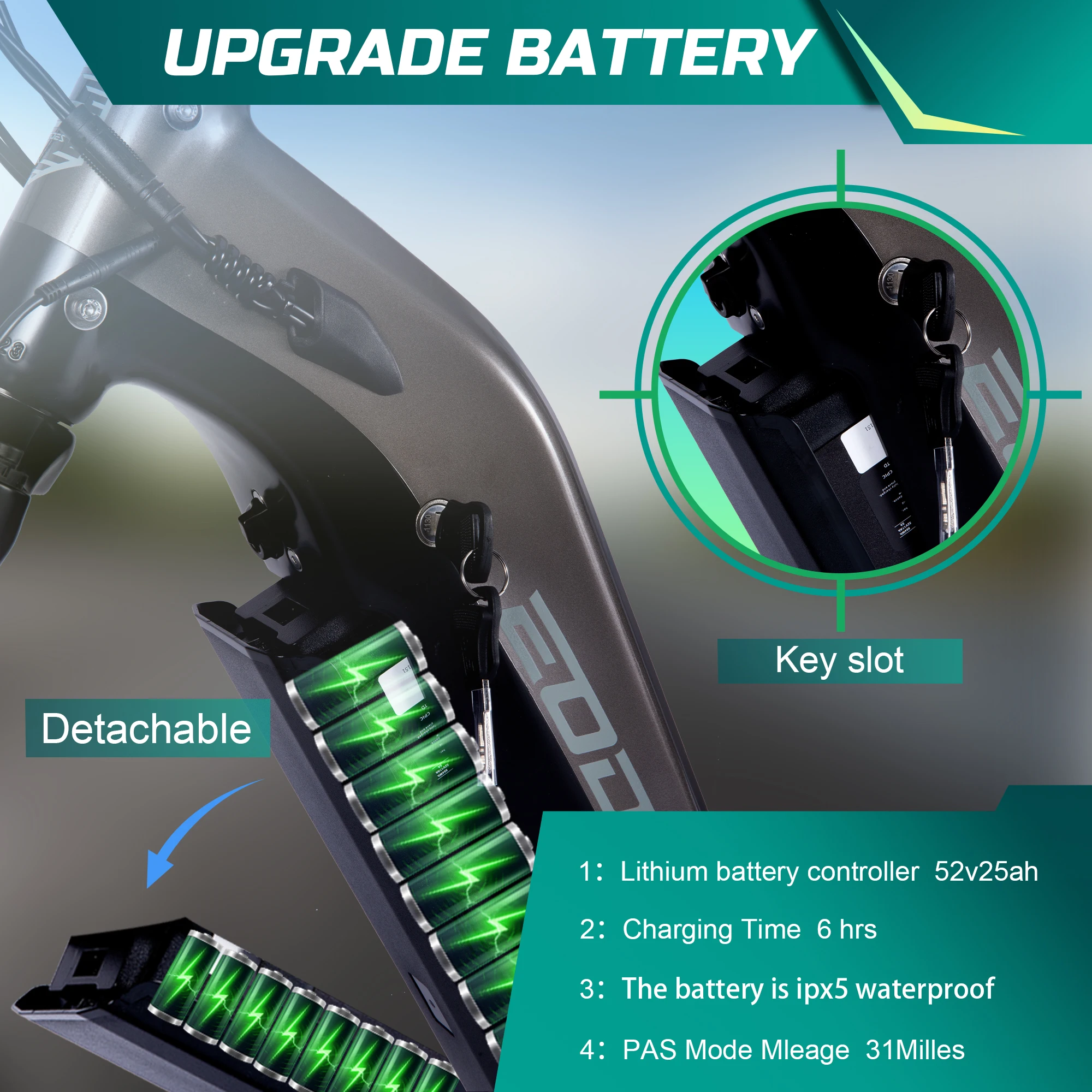Battery Capacity: Long-range 52V 17Ah lithium battery delivers up to 100KM (62 miles) per charge depending on conditions.