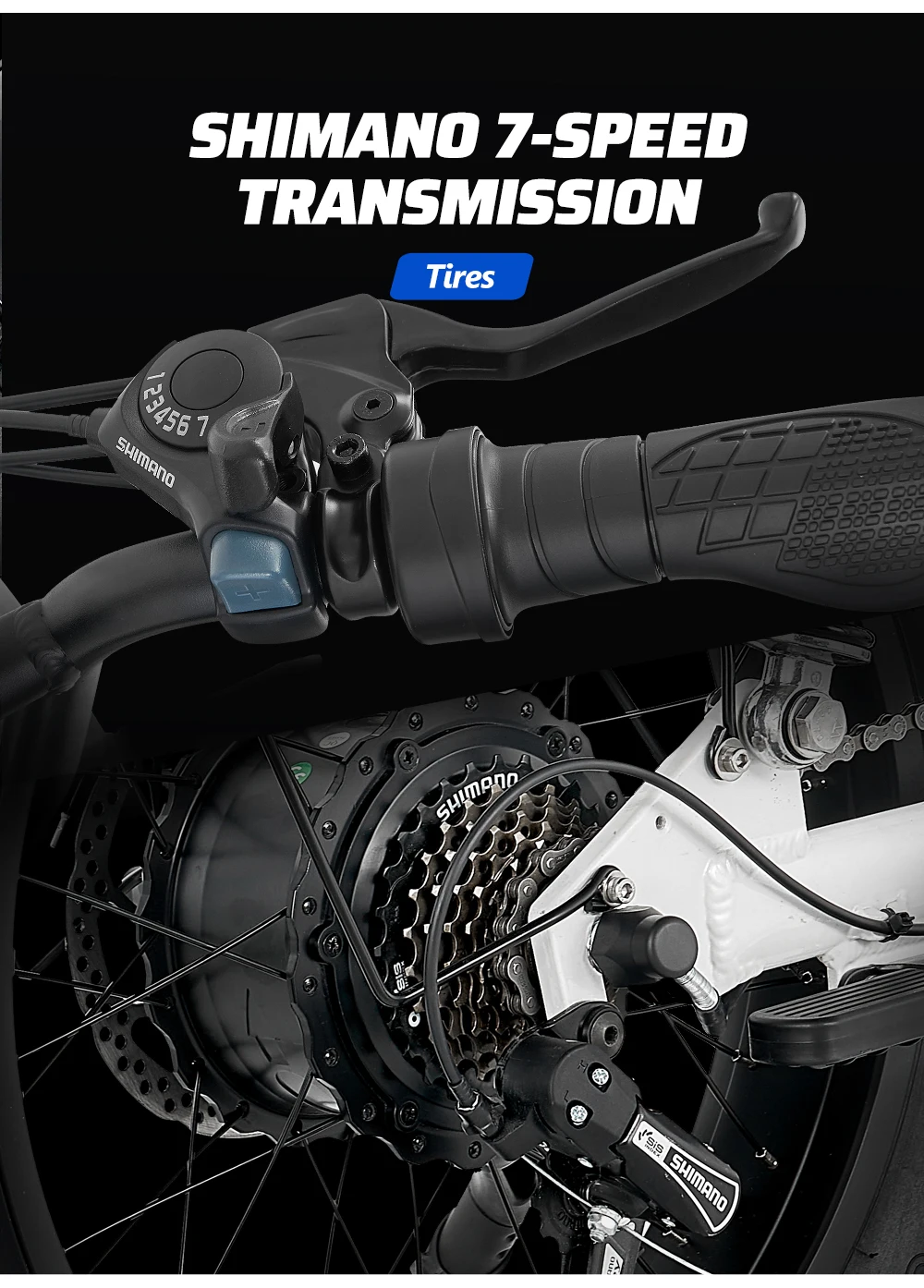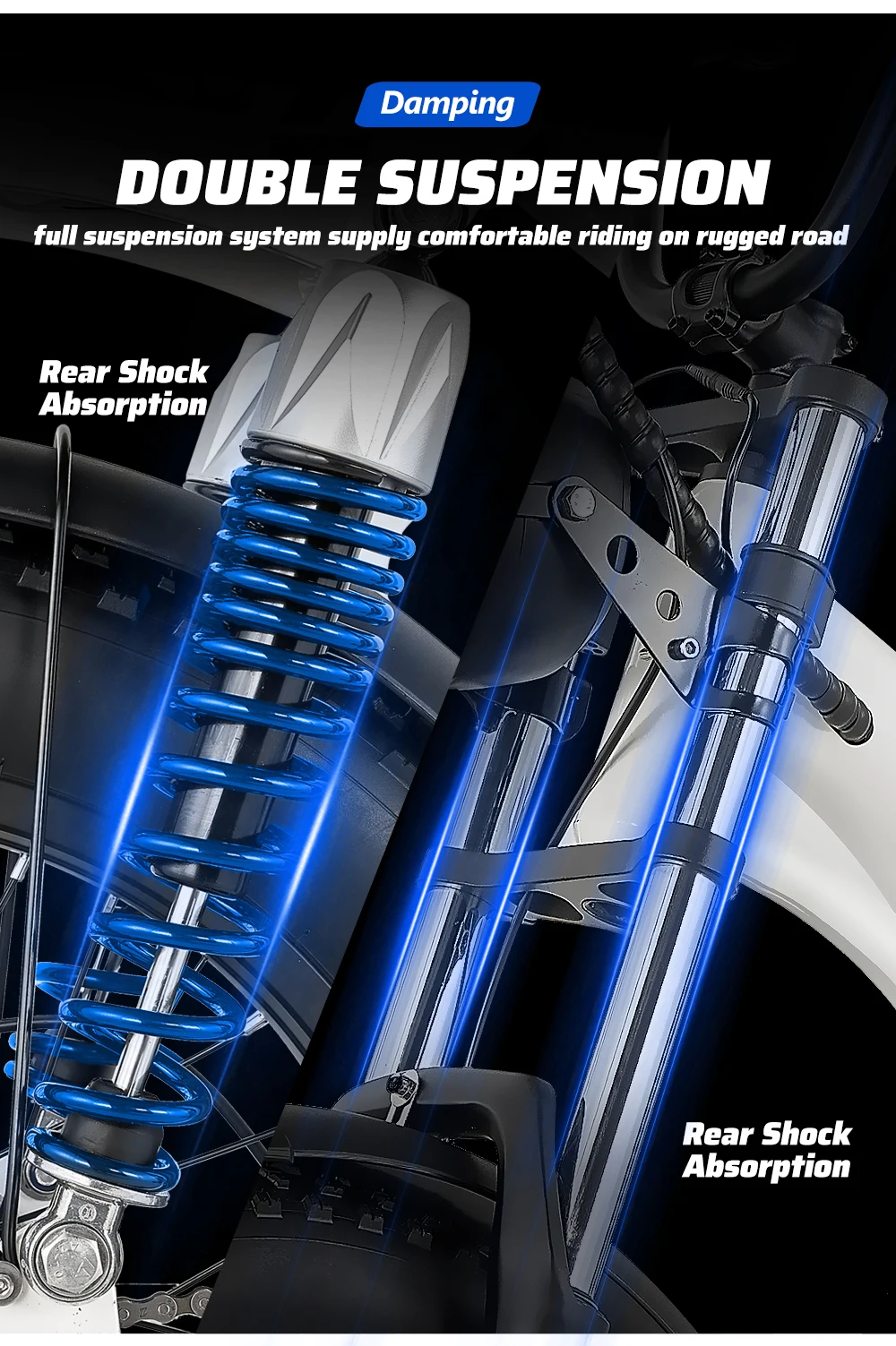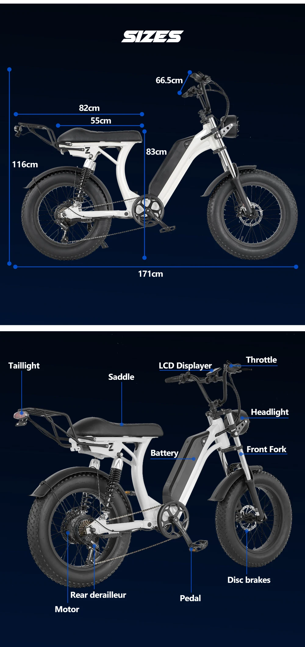 Versatile 20″ Fat Tires and front suspension fork—ideal for sand, gravel, urban roads, and mild trails .