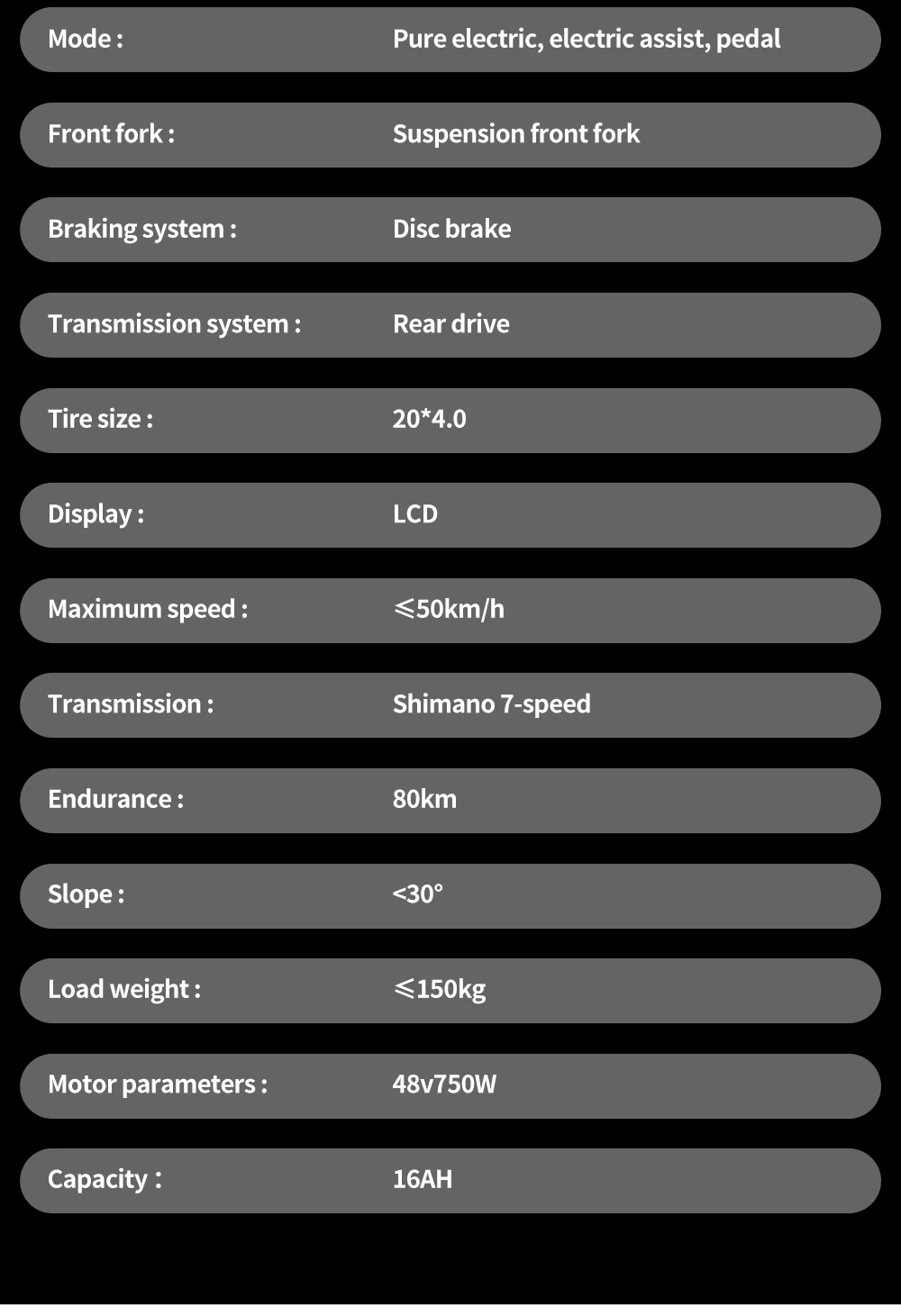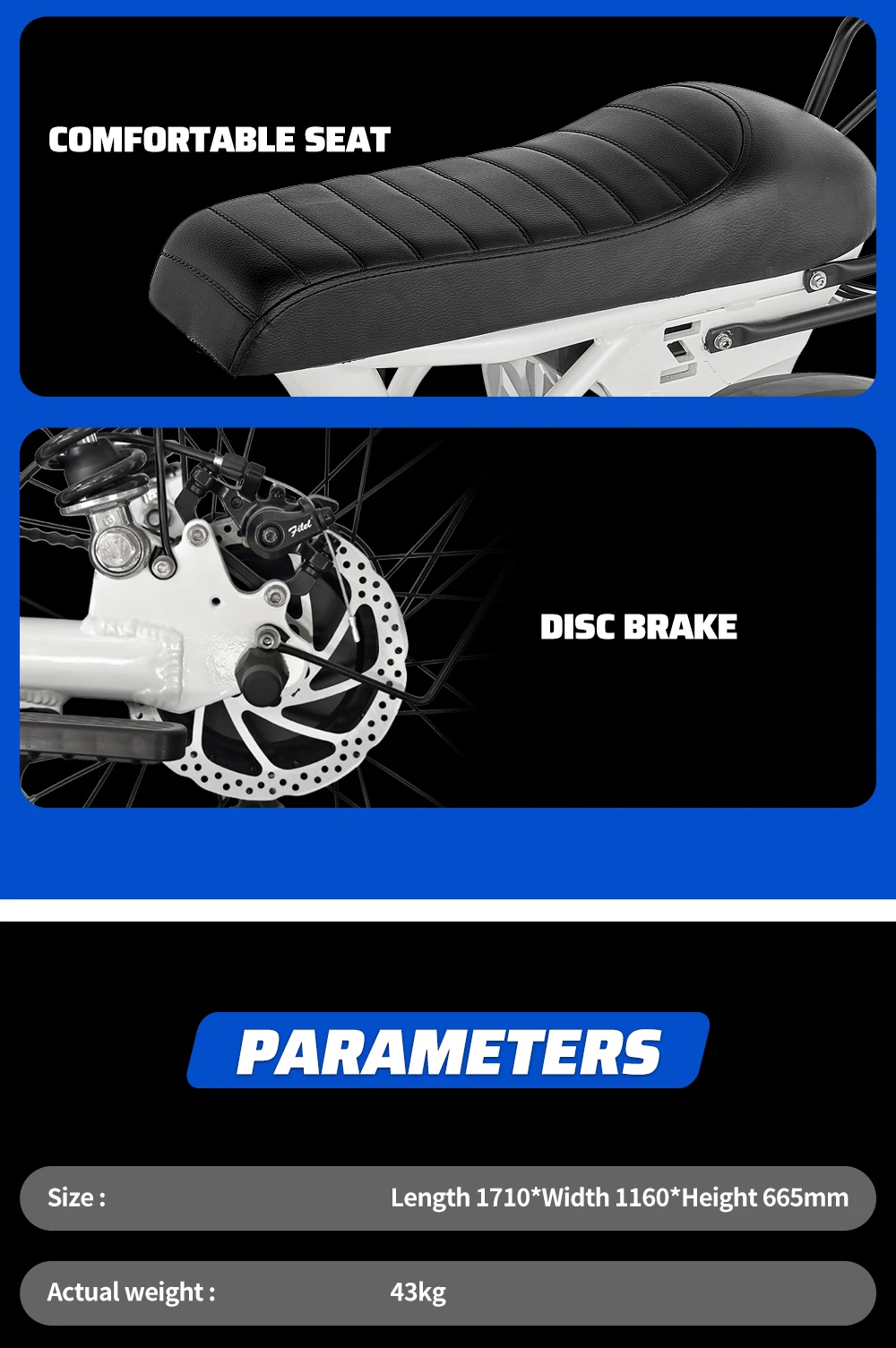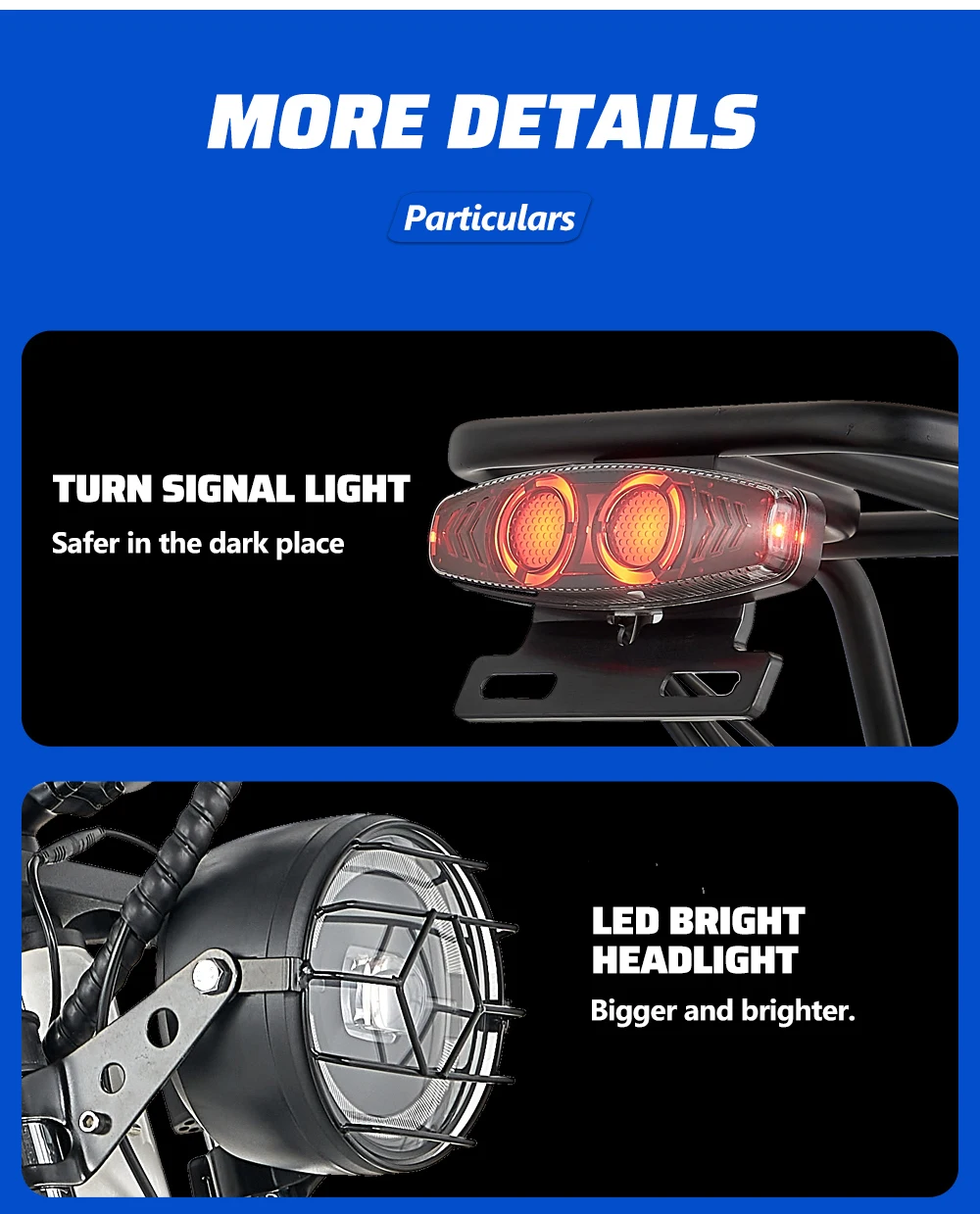 Versatile 20″ Fat Tires and front suspension fork—ideal for sand, gravel, urban roads, and mild trails .