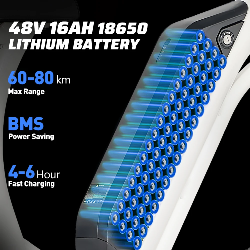 Wide-Range Battery: 48 V 16 Ah lithium-ion battery (≈768 Wh) delivering 31–60 km per charge, removable for easy off-bike charging .
