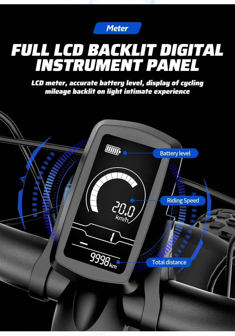 User-Friendly Console: LCD display provides speed, battery levels, pedal-assist modes (0–5), and headlight control