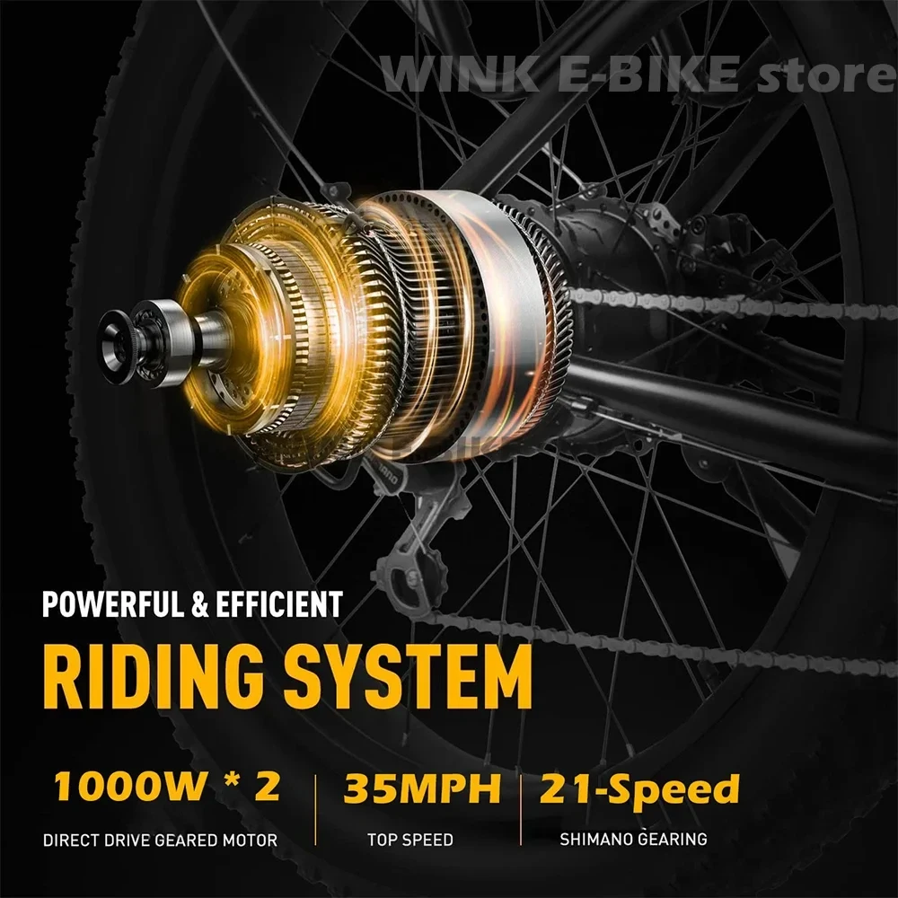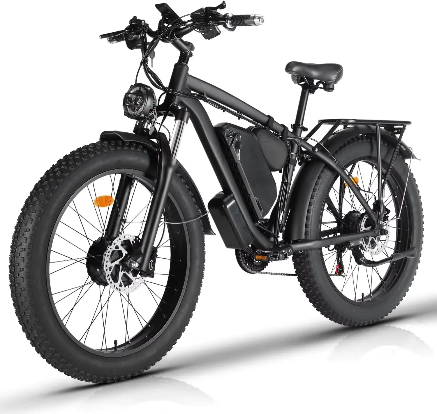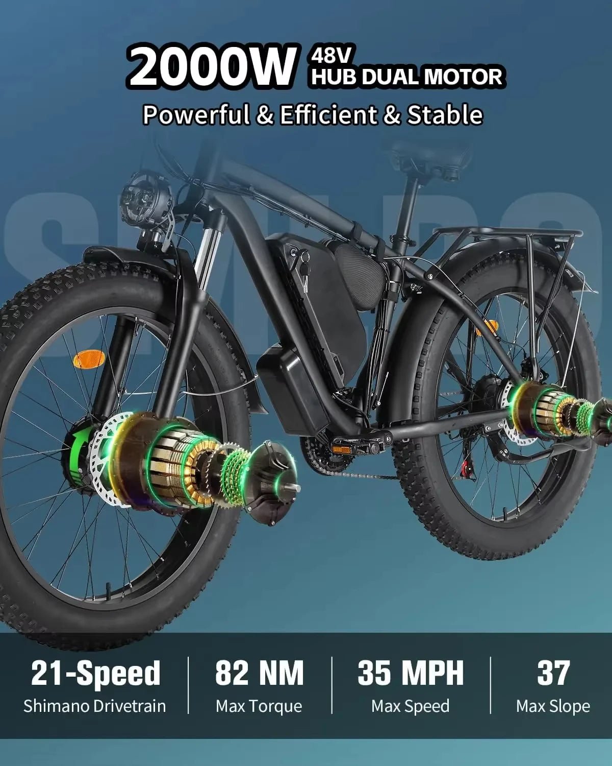 Dual 1000W Motors (2000W Total): This e-bike features two powerful brushless motors, providing 2000W of total power, which ensures superior torque and speed for tackling steep hills, rough trails, and off-road adventures. The dual motors allow for exceptional performance in challenging terrains.