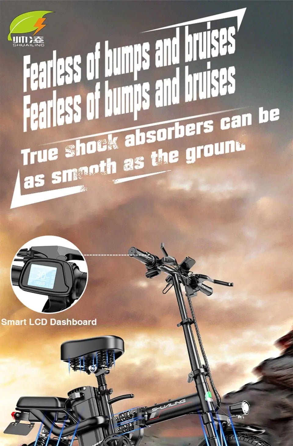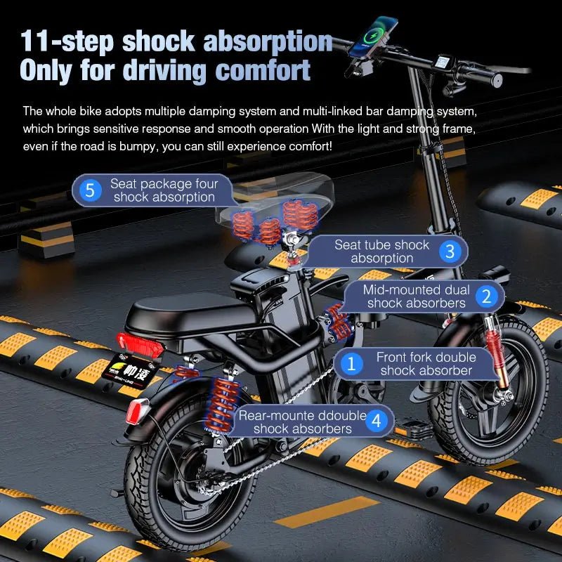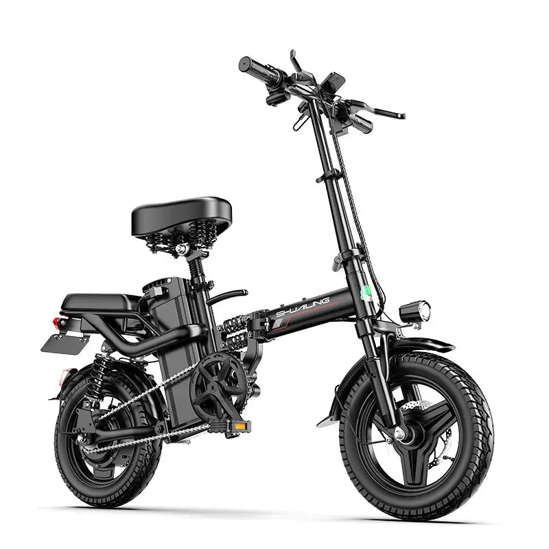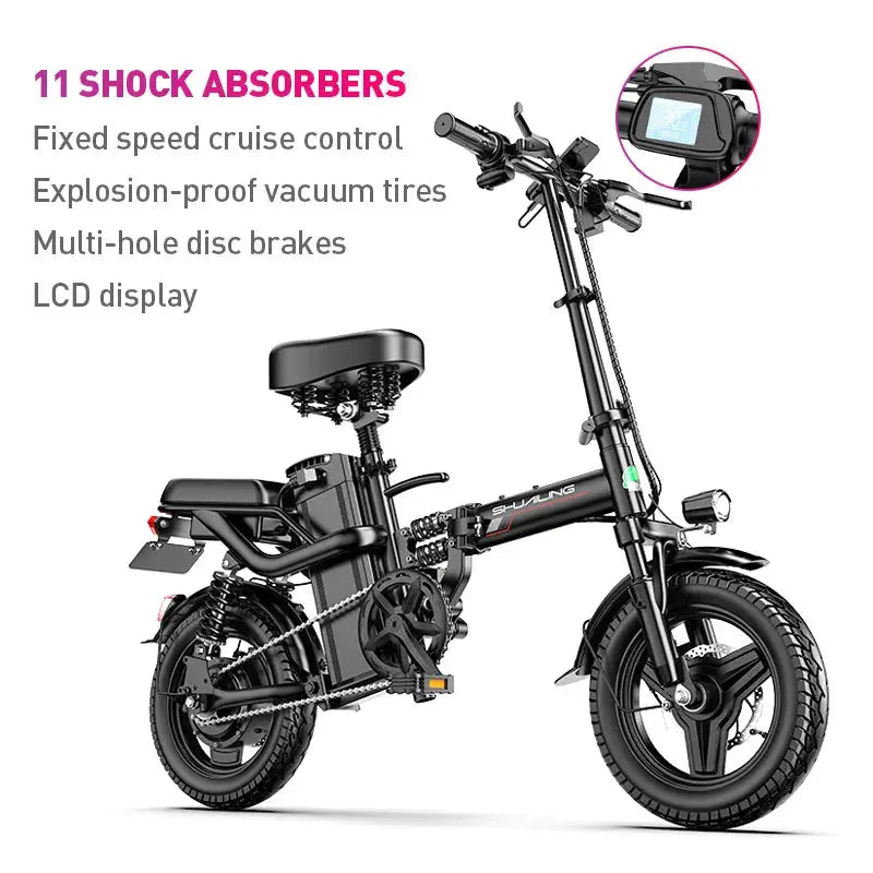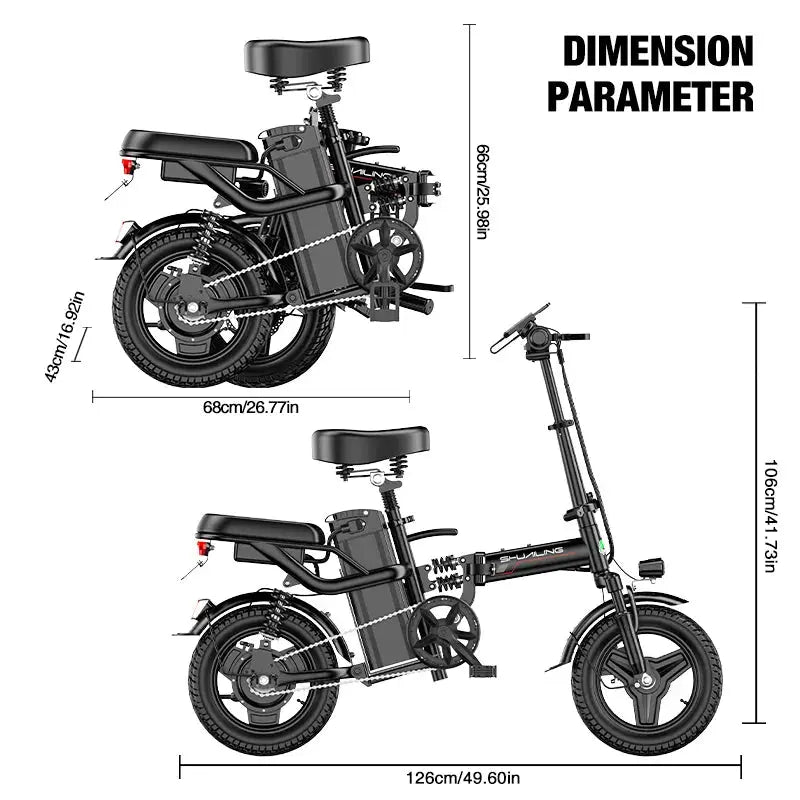 Designed for convenience, the Shuailing A9 features a foldable frame, making it easy to store and transport, perfect for commuters or those with limited space. The 14-inch wheels provide a smooth and stable ride, while the steel frame ensures durability and strength. Whether you're riding around town or cruising on your favorite path, this mini electric bike offers both comfort and performance.