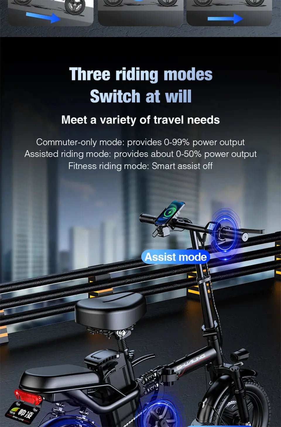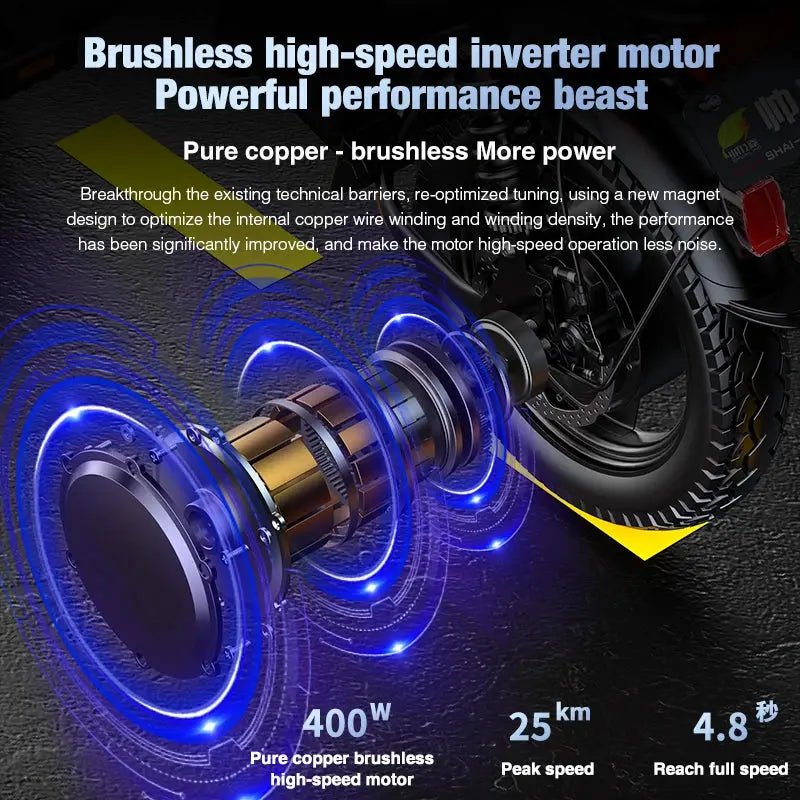 The Shuailing A9 Mini E-Bike offers the perfect combination of speed, portability, and style. With a 500W brushless motor, the A9 can reach a maximum speed of 50KM/H (30mph), making it ideal for quick commutes and urban rides. Powered by a 48V lithium battery, it provides a range of 60KM on a single charge, allowing you to cover substantial distances with ease.