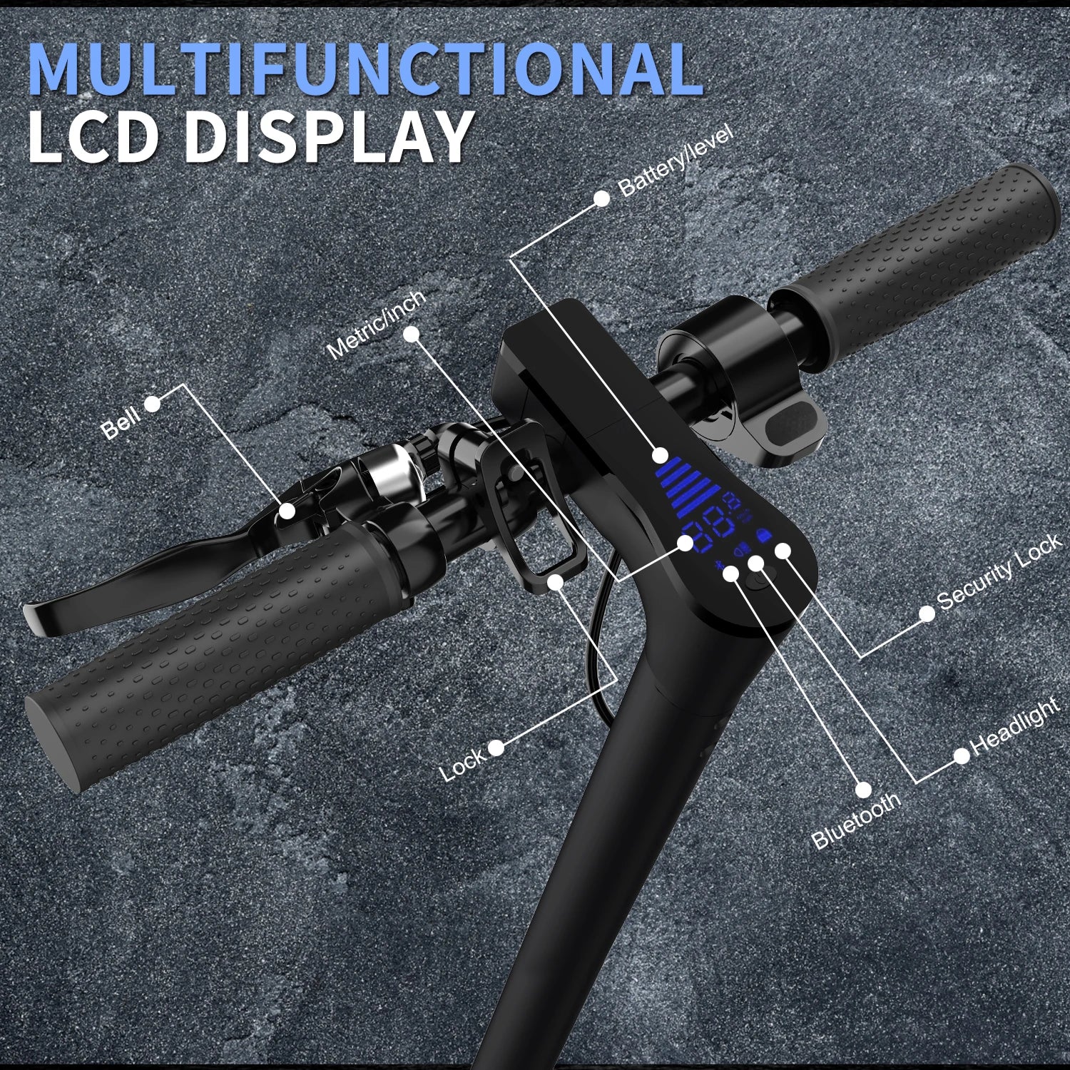 【Adults Electric Scooter With Upgraded Safety & Comfort 】 Stay safe with ultra-bright headlight and brake light, and stop quickly with the double braking system featuring disc braking and E-ABS braking. Enjoy a comfortable driving experience with 10 inch solid honeycomb tires and rear shock absorbers. Max loading weight: 120KG