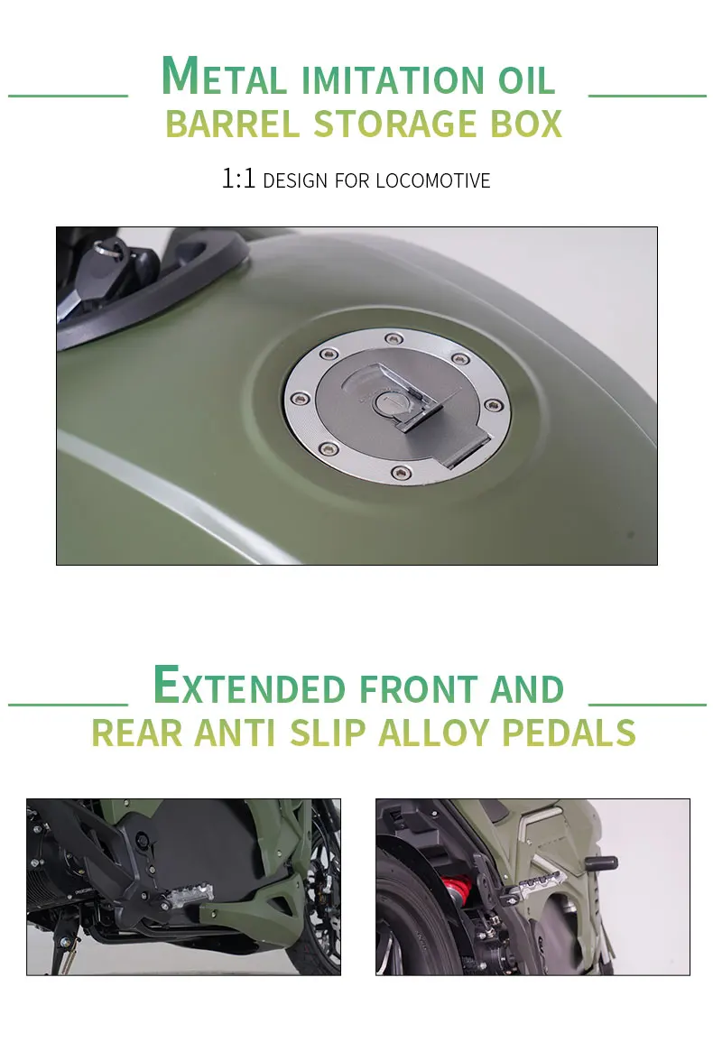 - Oversized 17″ Tires: High-traction setup—110/70‑17 (front) and 140/70‑17 (rear)—designed for sporty handling and stability on off-road terrain