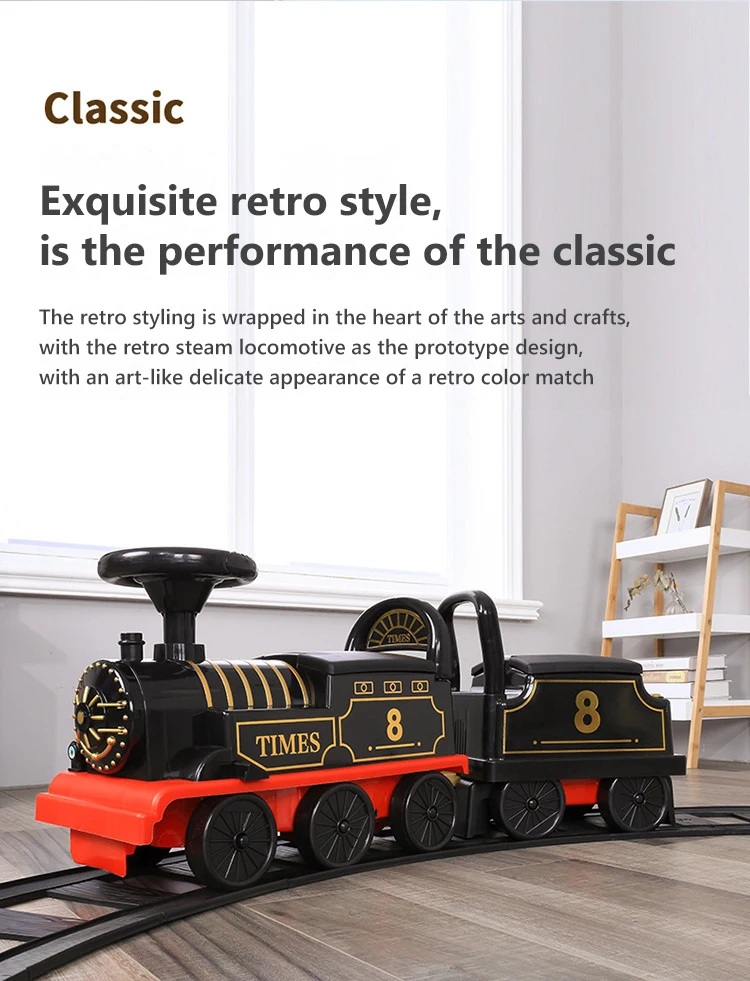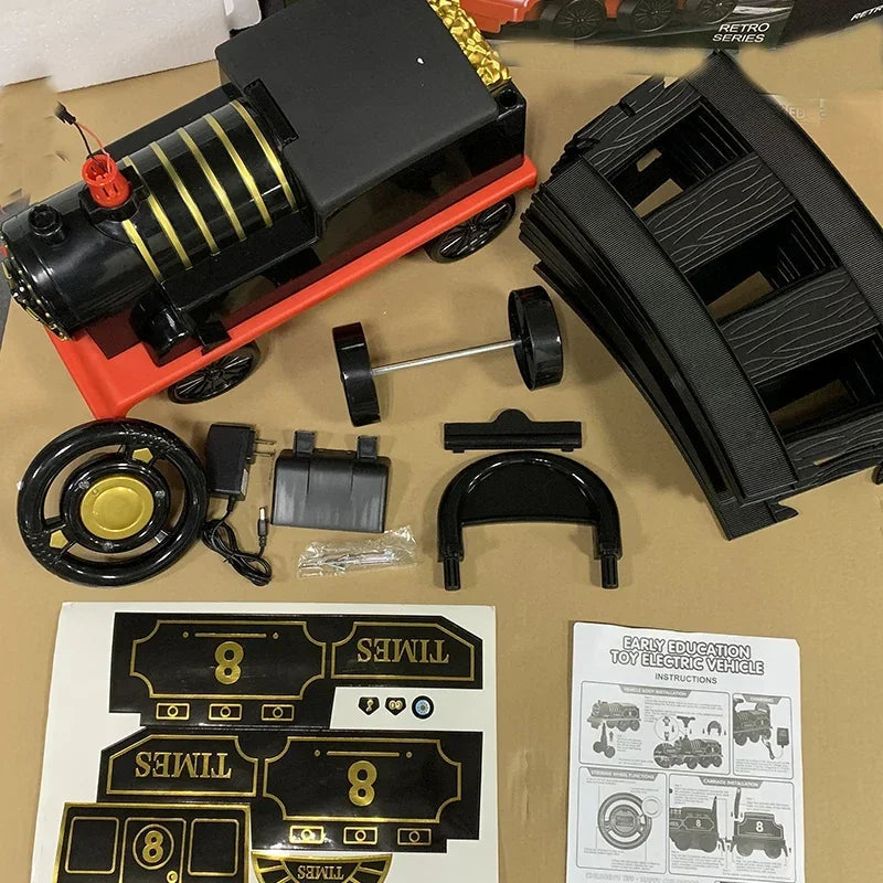 Fuel your child's imagination with this enchanting Electric Retro Train Ride-On Toy, featuring a majestic locomotive and multiple charming carriages. Inspired by classic railways, this large-scale ride-on toy delivers both nostalgia and fun.