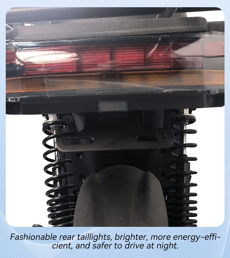 This electric bicycle has a new national standard EEC certification, strong configuration, and efficient performance.rechargeable, quad shock absorber, 1500W pure copper brushless motor, vacuum explosion-proof tire, large brand battery, high carbon steel frame, anti-theft alarm, one key start, 3-speed transmission, E-ABS front and rear drum brakes, LED high-efficiency waterproof and high brightness headlights, high elastic shock absorber large cushion, large capacity car frame, intelligent display instrument panel, clear lighting/power/undervoltage at a glance.