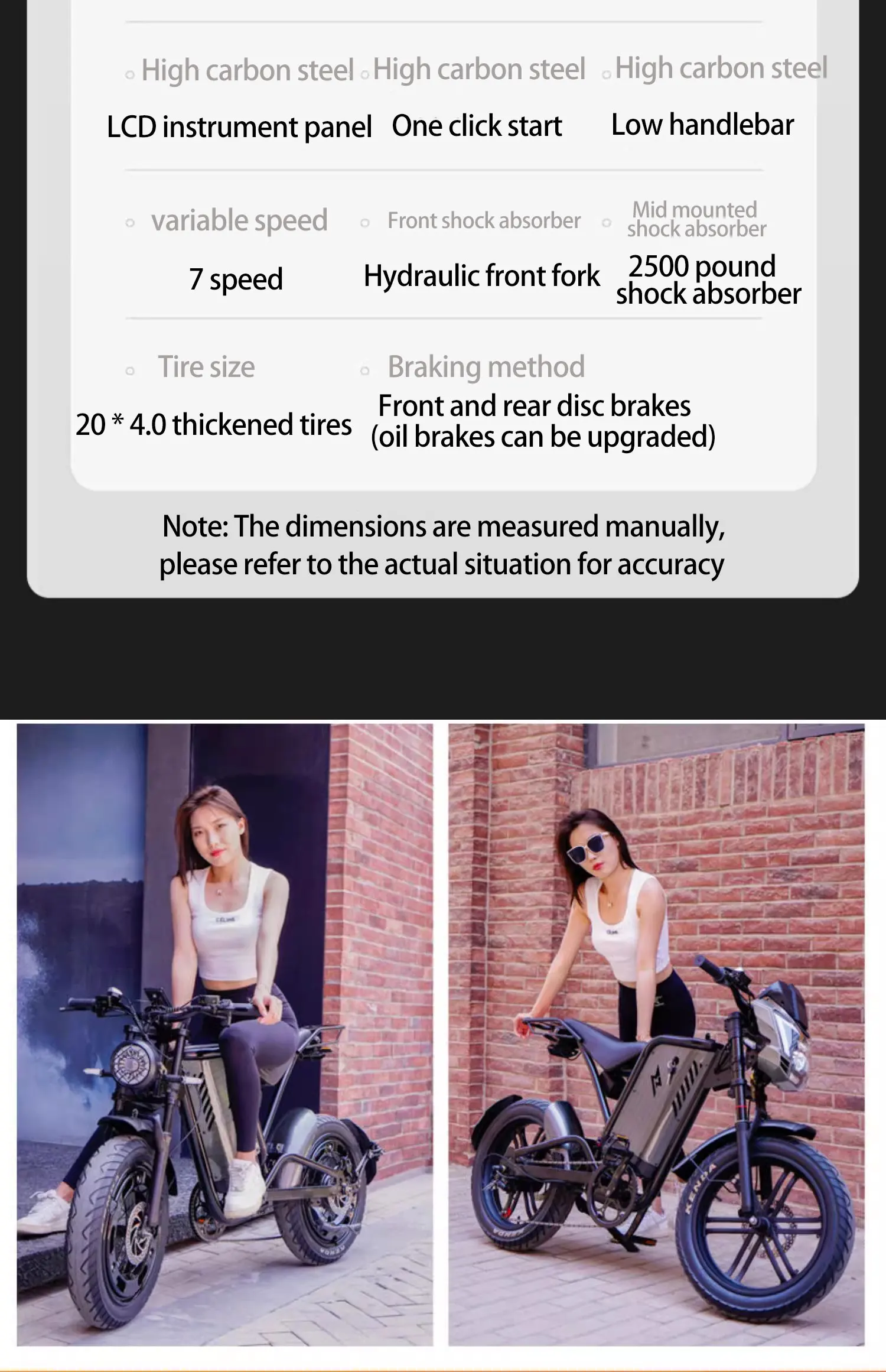 Designed for comfort and durability, the XDZJ1 is equipped with 20" fat tires that provide excellent traction and stability across various terrains. The 7-speed gearing system allows for versatile riding experiences, while the disc brakes ensure reliable stopping power.